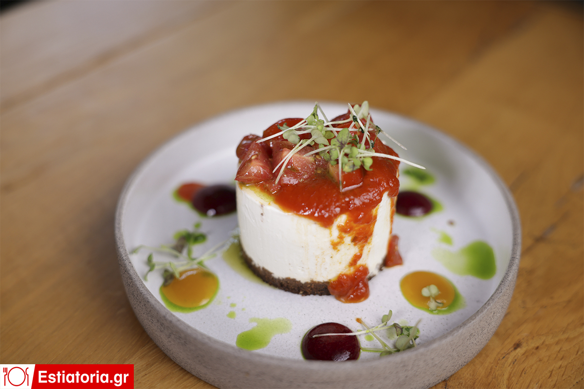 Αλμυρό Cheesecake με φέτα, ανθότυρο, μπισκότα από κρητικά παξιμάδια και chutney ντομάτας και πράσινου μήλου