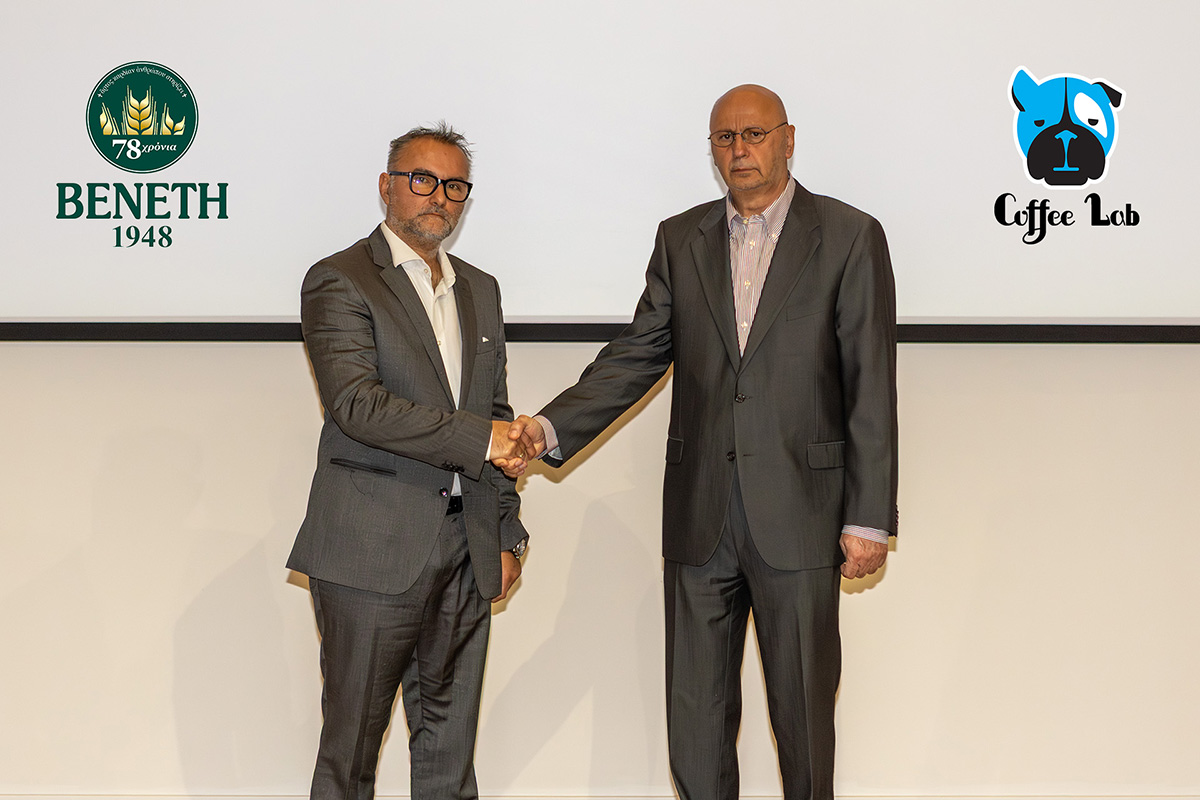 Aπό αριστερά: Στέλιος Ρουμελιώτης CEO της Coffee Lab, Παναγιώτης Μονεμβασιώτης Πρόεδρος και Διευθύνων Σύμβουλος εταιρείας ΒΕΝΕΤΗ